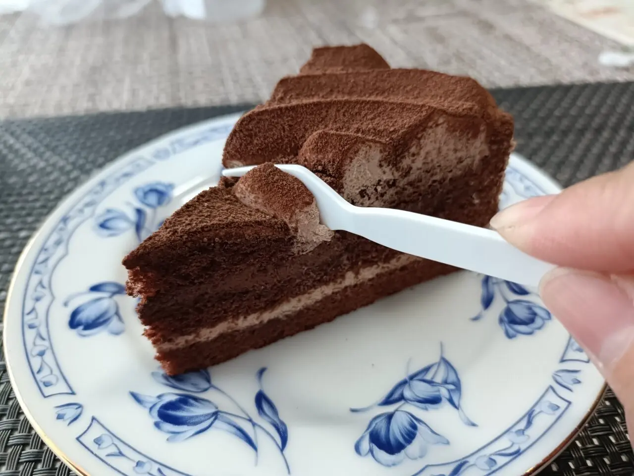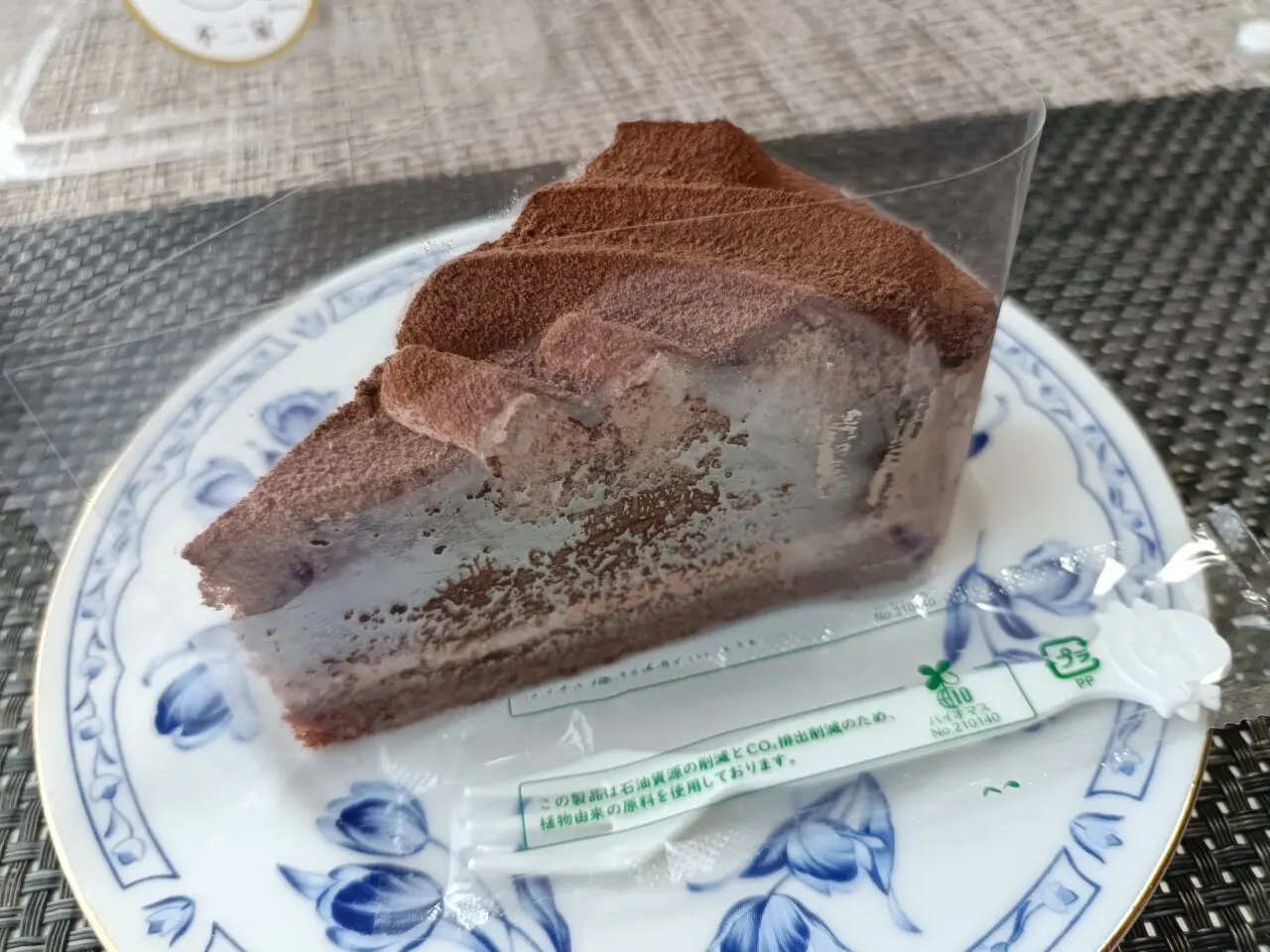 「ハイカカオチョコレートケーキ」です。冷凍のケーキとは思えないくらい、スポンジはふわふわ!濃厚ながらもほんのりビターな、大人な味わいが楽しめました。