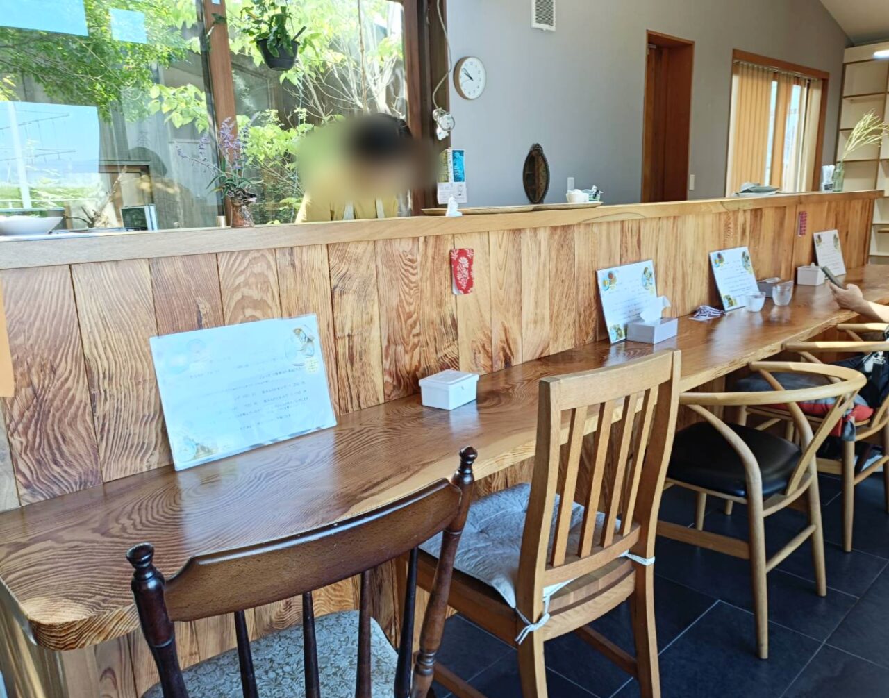 大きな窓ガラスからは木漏れ日のような優しい光が差し込み、優雅な雰囲気でゆったりとおしゃべりできそうなテーブル席と、カウンターが7席あります。