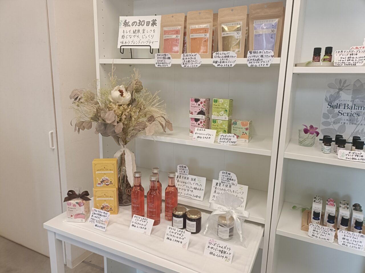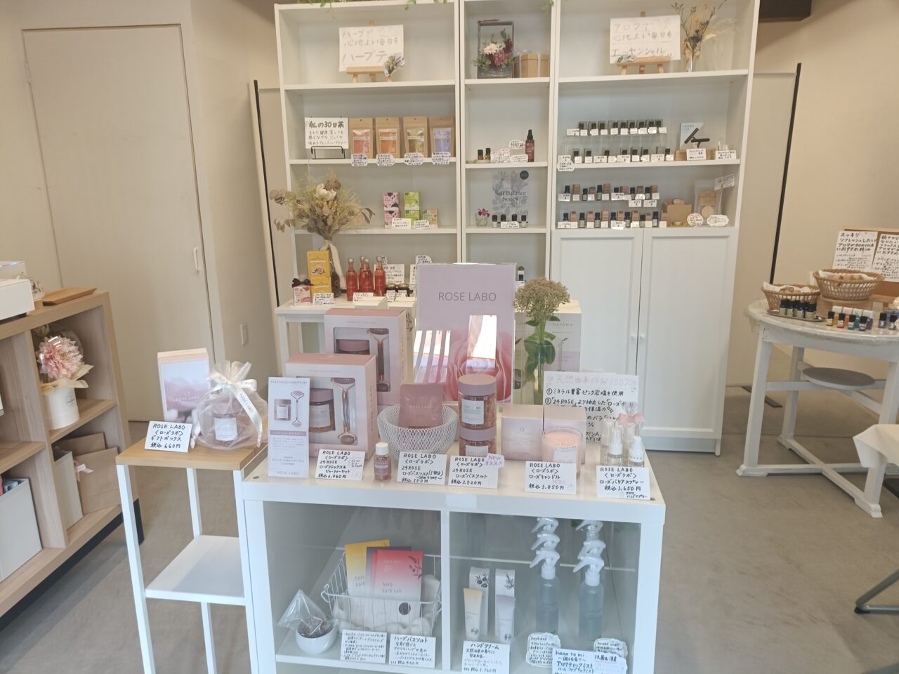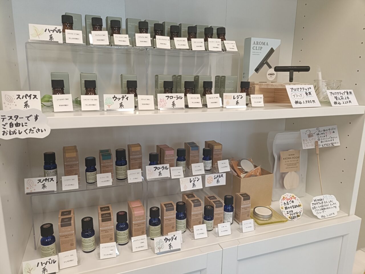 店内には、エッセンシャルオイルやアロマスプレー、ディフューザーなど、香りで日々の生活を豊かに楽しむためのアイテムが豊富に並んでいます。