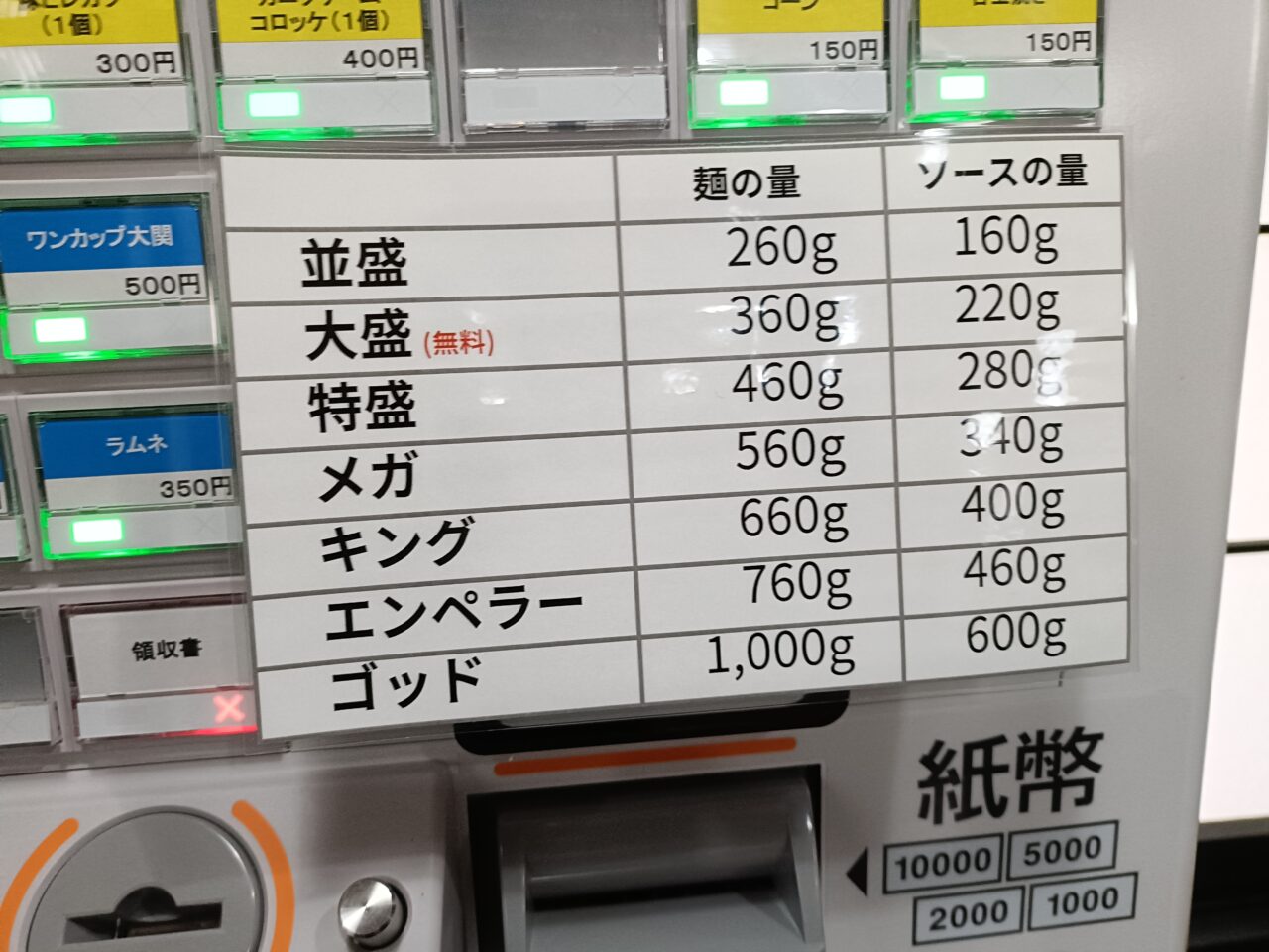 麺のサイズは並盛(260g)から“ゴッド”(1kg)まで選べ、なんと大盛は無料サービス!
