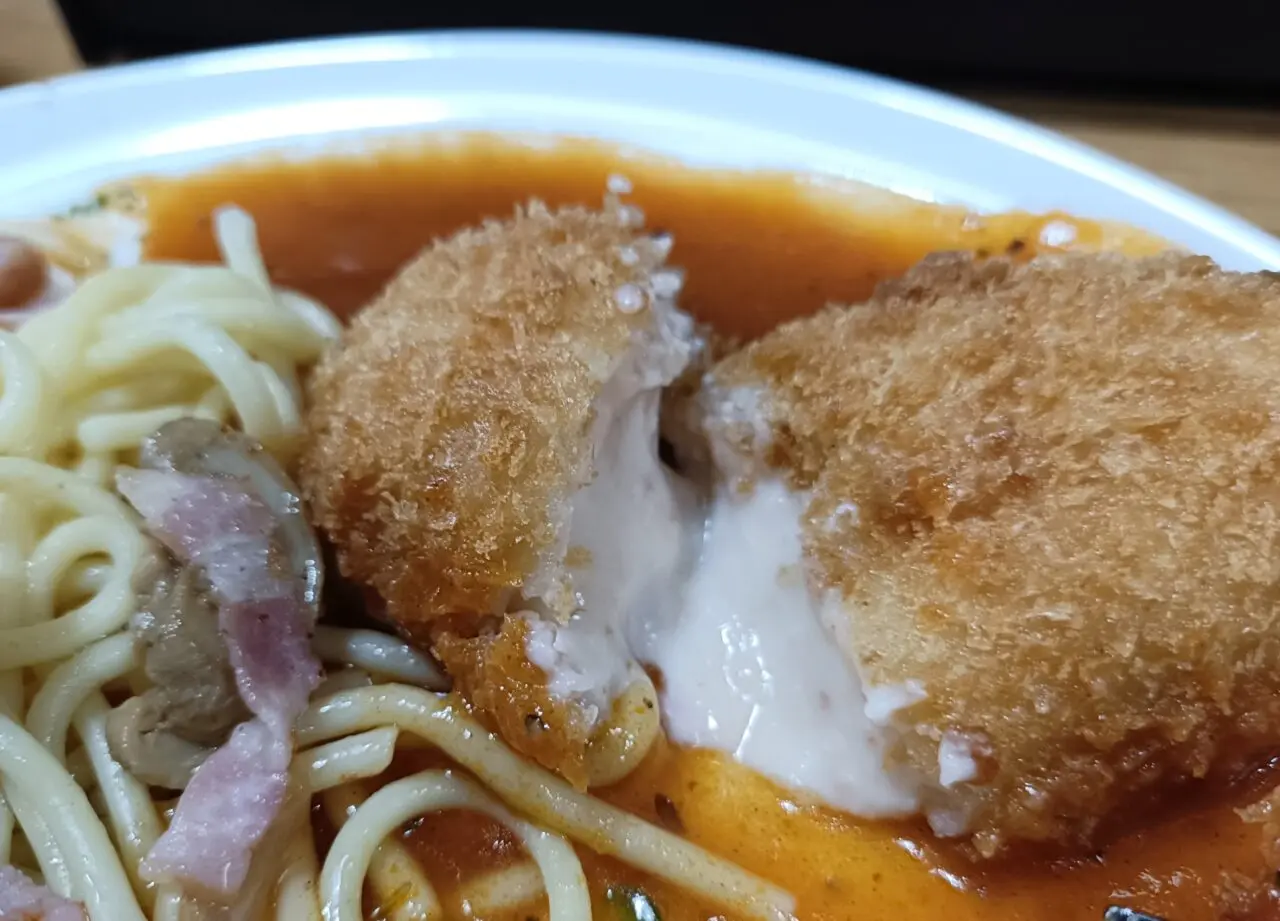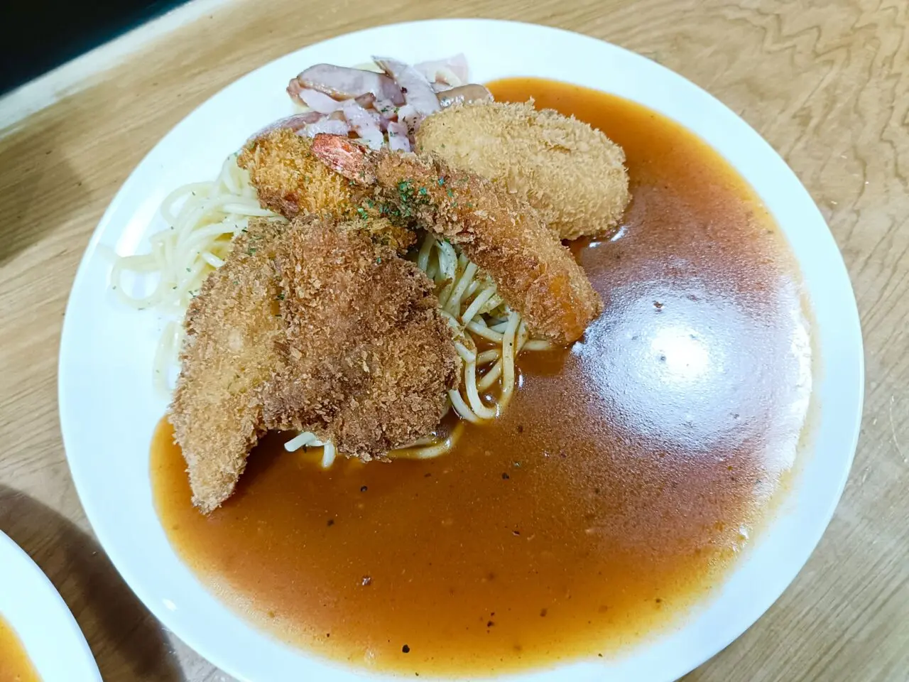 トッピングのえびフライや白身魚なども、厳選された素材でサクッと香ばしく、とても美味。カニクリームコロッケはトロっとほんのり甘く、スパイシーなソースをまろやかにしてくれます。