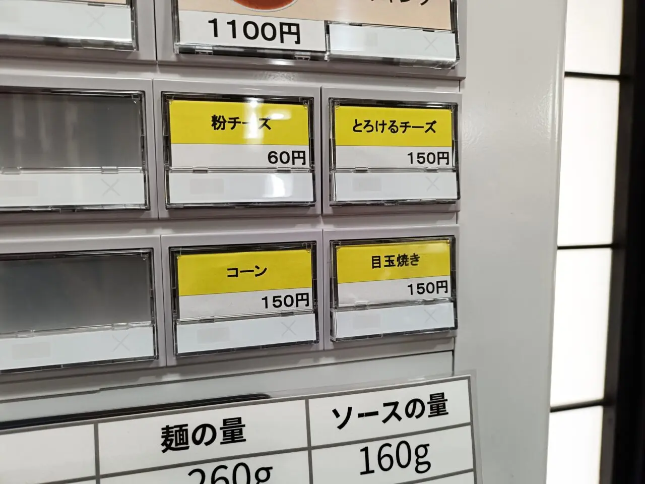 プラス料金で、粉チーズやとろけるチーズ、コーン、目玉焼き、各種フライのトッピングもできます。