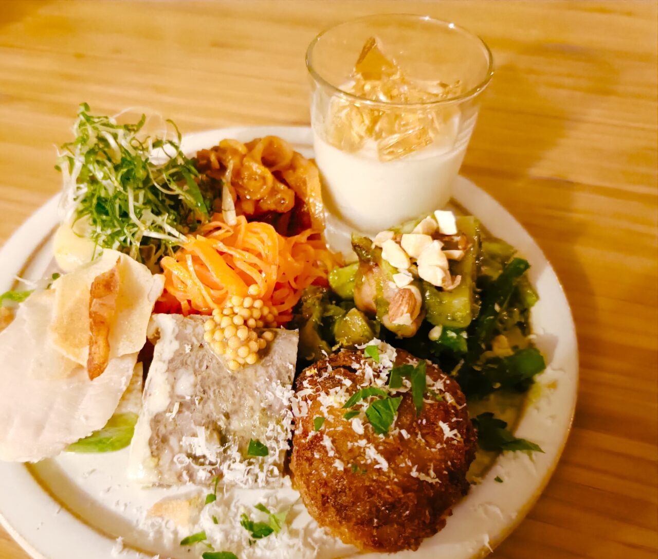 前菜の盛り合わせには、切り干し大根をピリッとトマトソースで和えたアラビアータや、筑前煮をイメージした根菜と白菜のテリーヌなど、和と洋の融合が楽しめる一品が並びます。