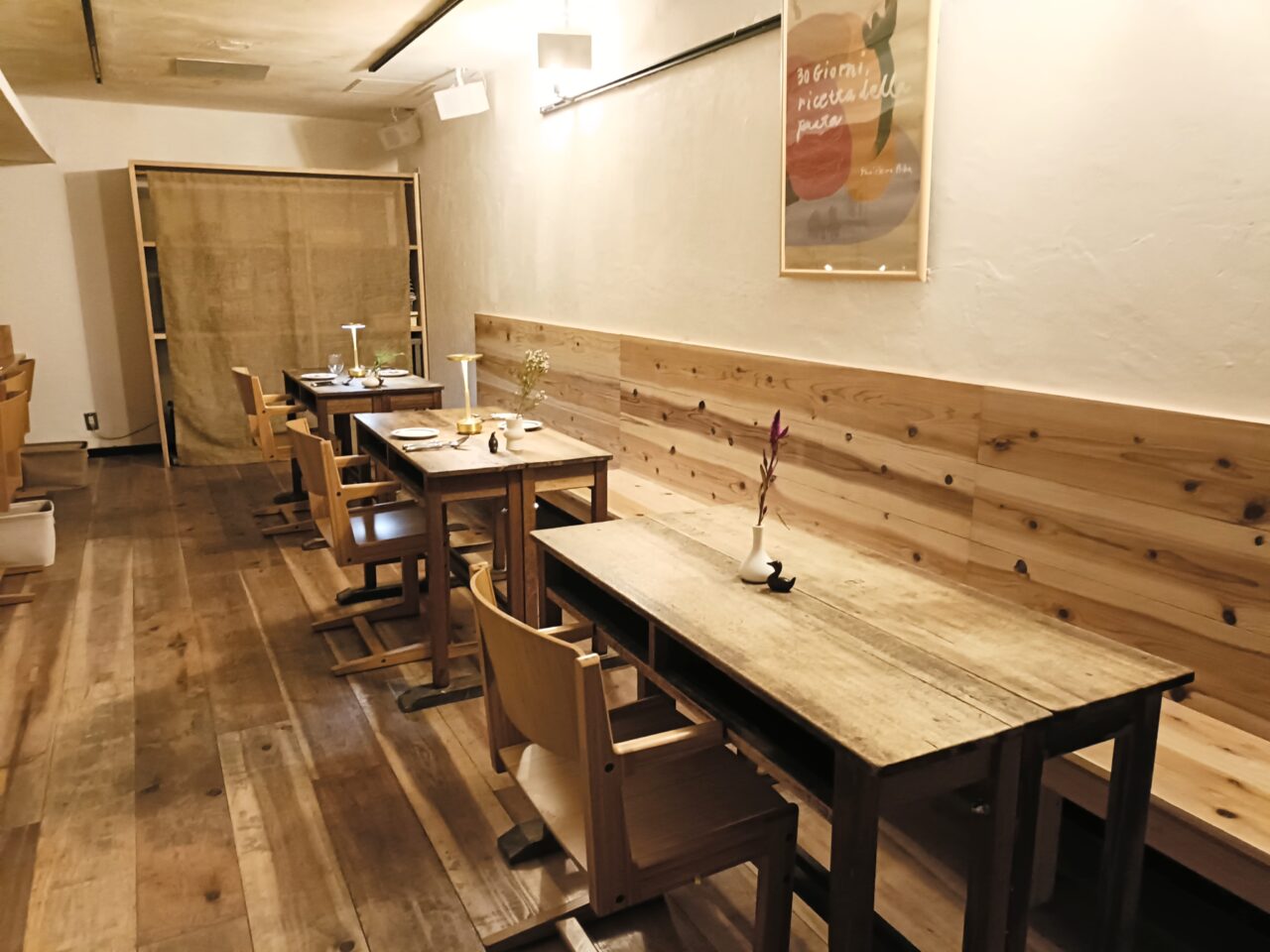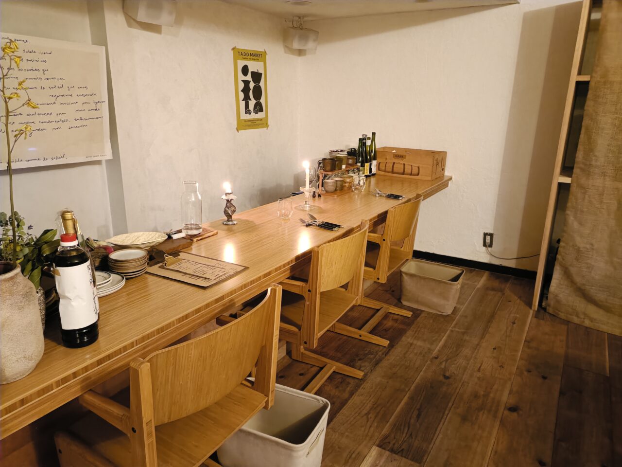 店内は、木の温もりを感じる落ち着いた雰囲気。シンプルながらも心地よい灯りがともり、特別な時間を静かに楽しめる隠れ家的空間となっています。