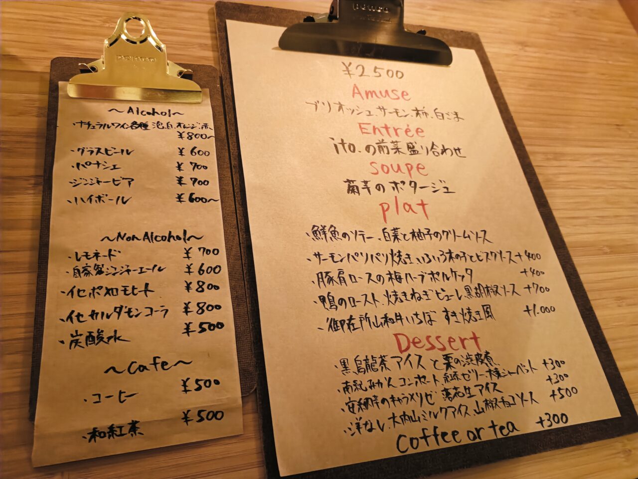 営業は日曜・月曜のみ。ランチは2,500円(税込)のショートコース1本(オプションあり)で、4〜5組(10〜12名)ほどの小さな空間でゆったりと過ごせます。