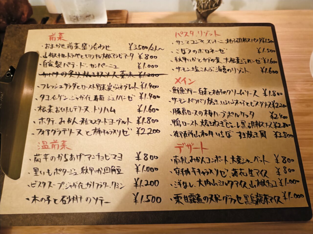 夜はアラカルトを中心に、ナチュラルワインに合う料理を提供されています。気軽に一皿から、ワイン一杯から楽しめるスタイルです。パスタも気になりますね。