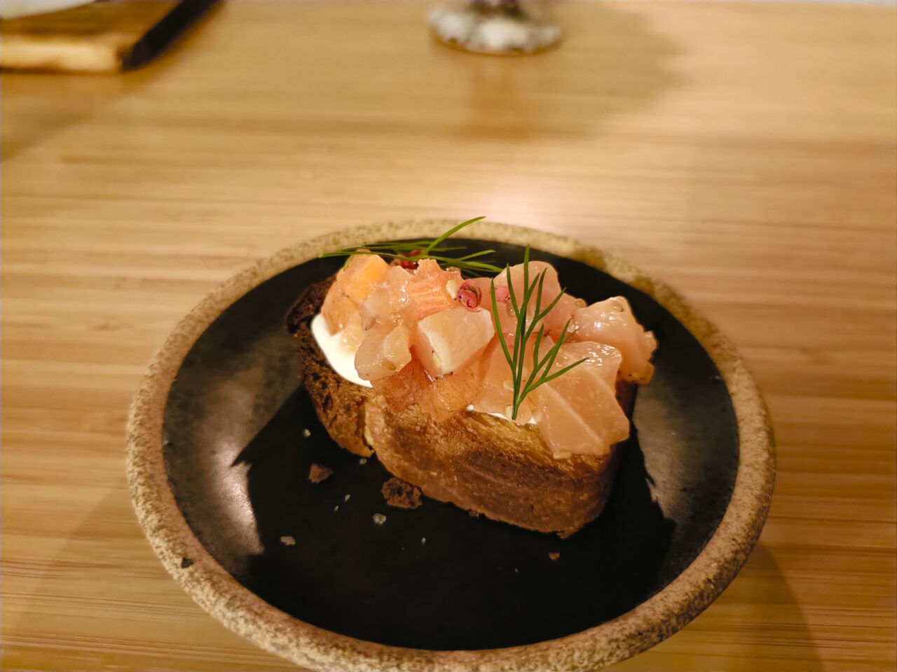 最初に登場したのは自家製ブリオッシュ。ほんのり甘い生地に、マスカルポーネとサーモン、柿、白ごまが絶妙にマッチ。ひと口ごとに味の表情が変わっていくようで、思わず笑みがこぼれるおいしさでした。