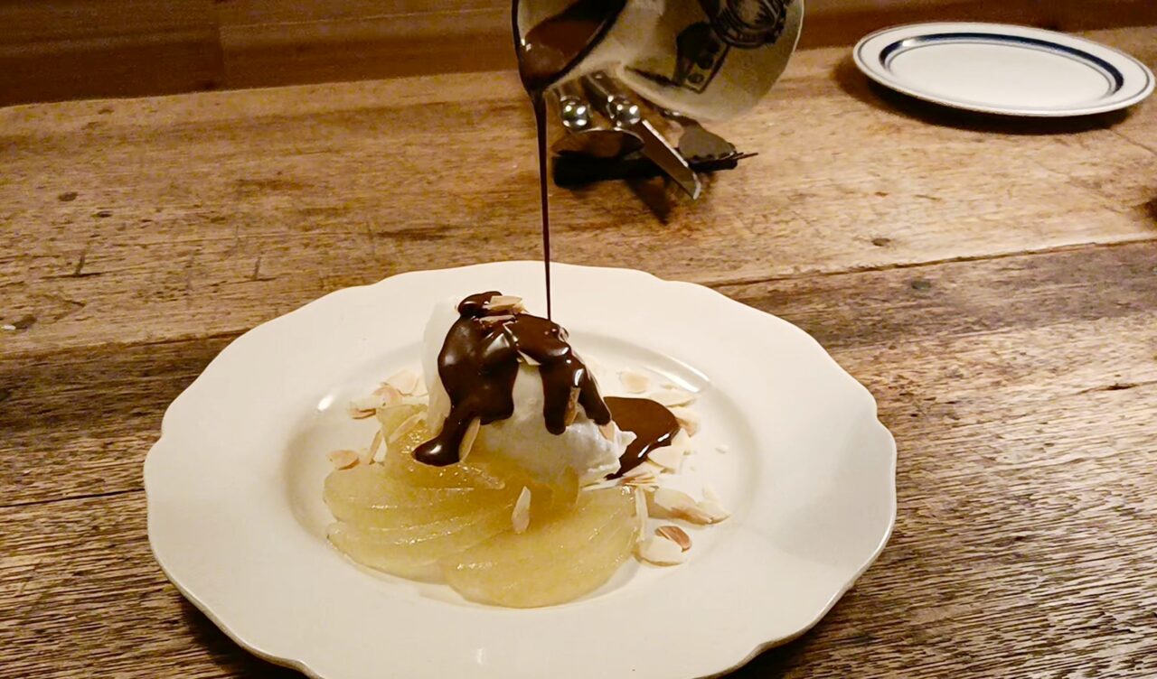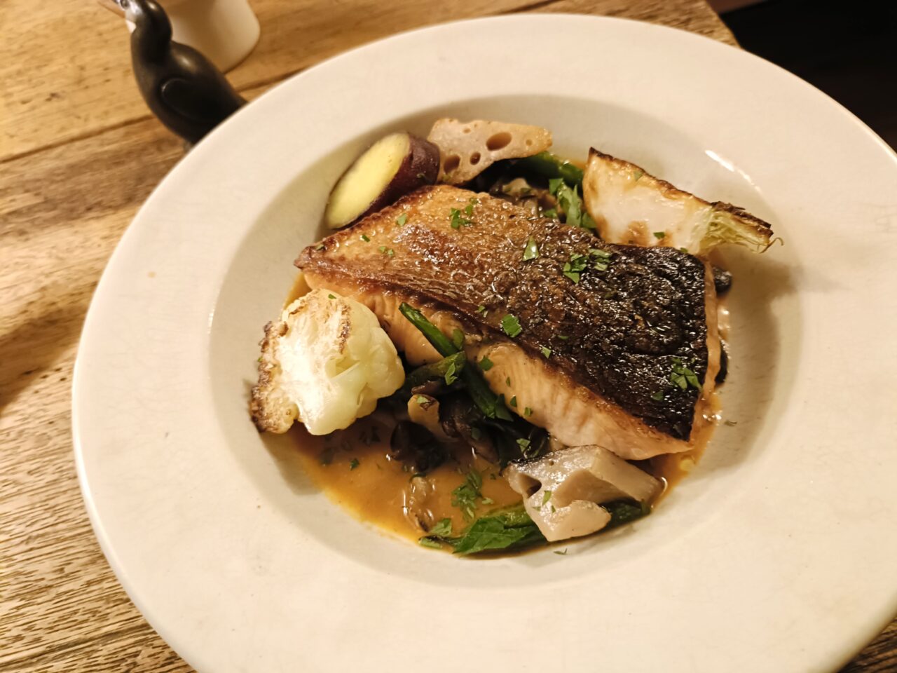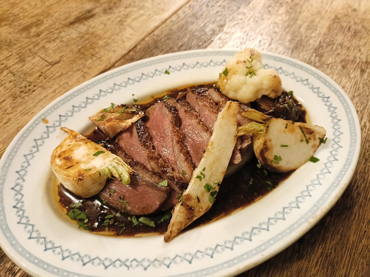 メインは鴨のロースト 焼きねぎピューレ黒胡椒ソース。柔らかくしっとりとした鴨は、ひと口食べると旨みがじんわり広がります。そこに合わせた焼きねぎピューレのやさしい甘さと、黒胡椒ソースのピリッとした辛みがちょうどいいバランスでした。