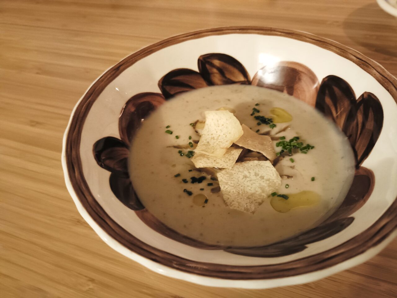 続いての菊芋のポタージュは、とろっとなめらかな口当たりで心あたたまる一品。シャキシャキの菊芋のきんぴらや、パリパリの里いもチップスが添えられ、食感の違いも楽しめます。