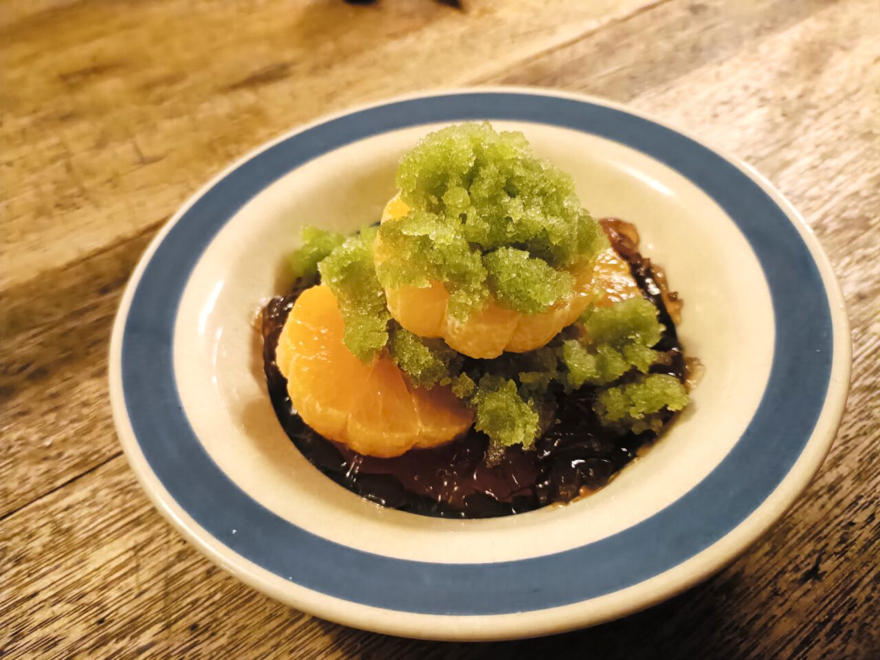 デザートは、南紀みかんコンポート 紅茶ゼリー 大葉シャーベットをチョイス。初めての組み合わせに驚きましたが、大葉の爽やかな香りと南紀みかんのジューシーな甘さ、紅茶の上品な風味が見事に調和していました。