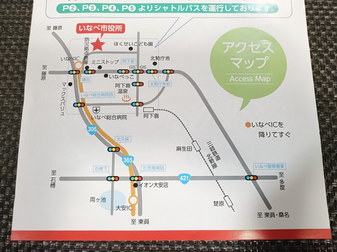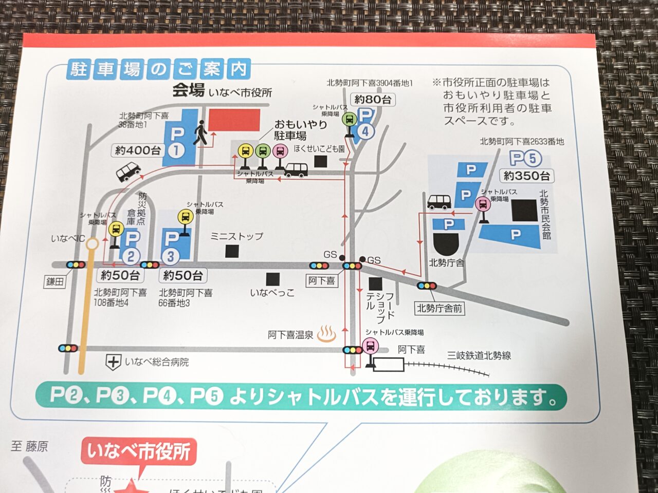 駐車場は約930台(P1〜P5)。P2・P3・P4・P5からは無料シャトルバス運行となります。いなべICからすぐのため、遠方からのアクセスも便利ですね。※市役所正面の駐車場はおもいやり駐車場と市役所利用者の駐車スペースとなります。