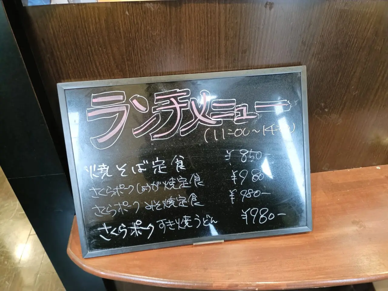 ランチには、「焼そば定食」や「さくらポーク すき焼きうどん」など、ボリュームのあるメニューも並び、11:00〜14:00まで利用できます。