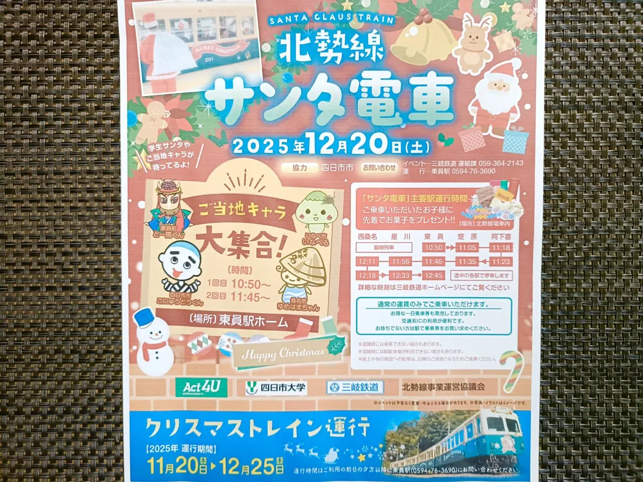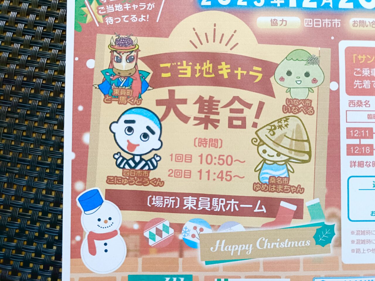また、東員駅ホームでは、四日市市の「こにゅうどうくん」、桑名市の「ゆめはまちゃん」などのご当地キャラクターや学生サンタが集合する特別イベントも開催されます♪時間は1回目が10:50~、2回目が11:45~となっており、写真撮影なども楽しめそうです。