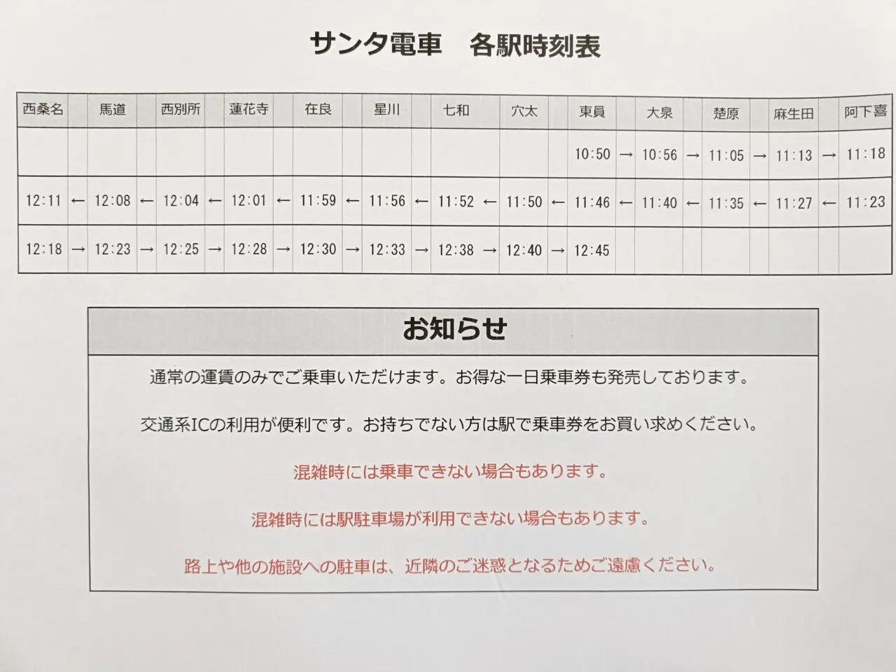 サンタ電車の主な運行時刻はこちら↓。途中の大泉、楚原、麻生田など各駅にも停車するため、沿線の駅から乗車しやすいのも魅力です。詳しい時刻については、事前にチラシや三岐鉄道の案内をご確認ください。