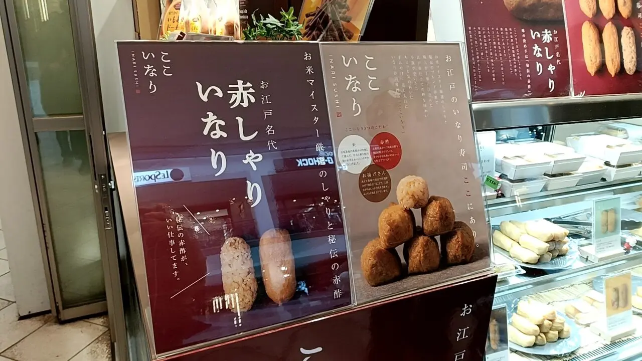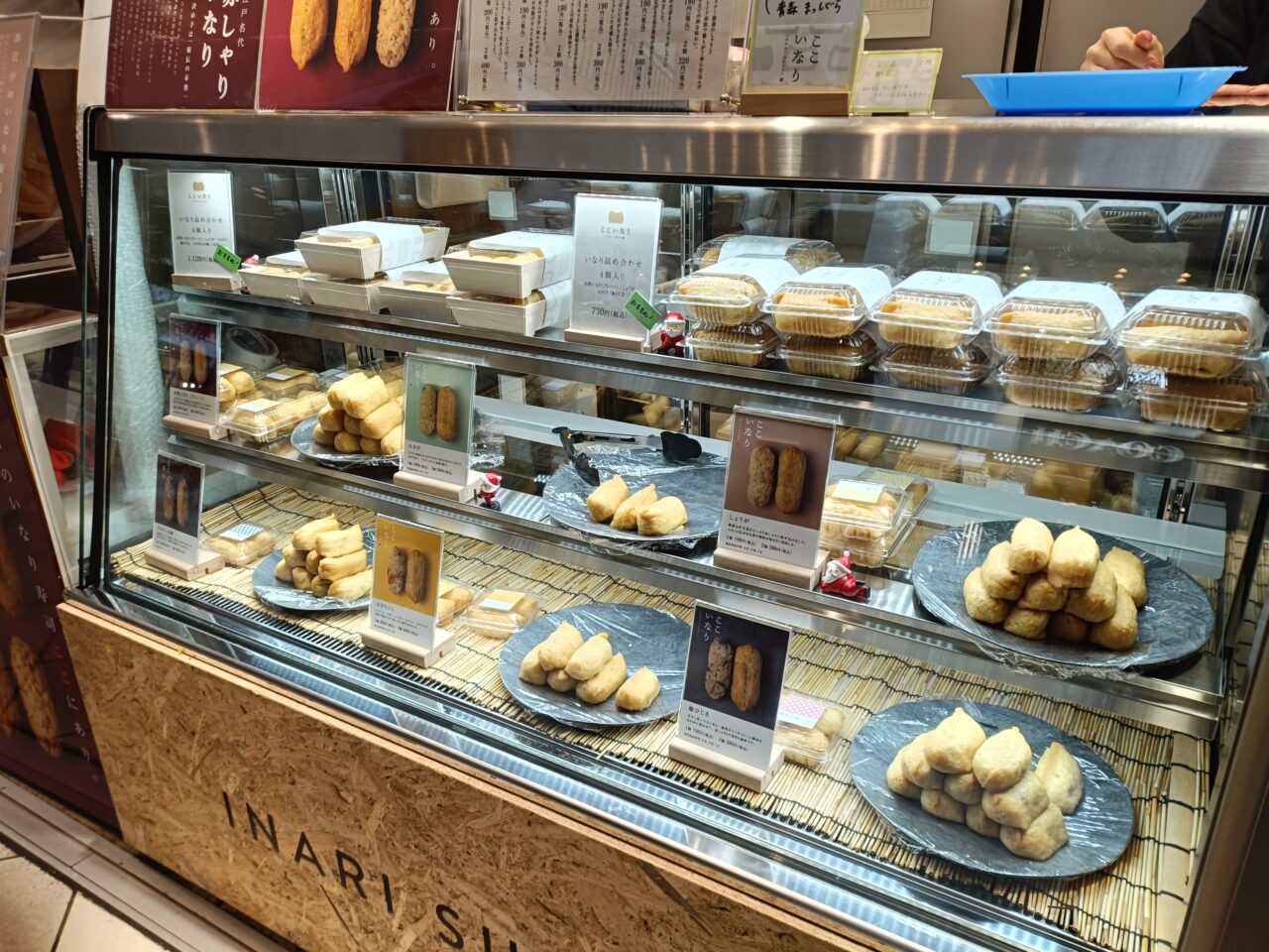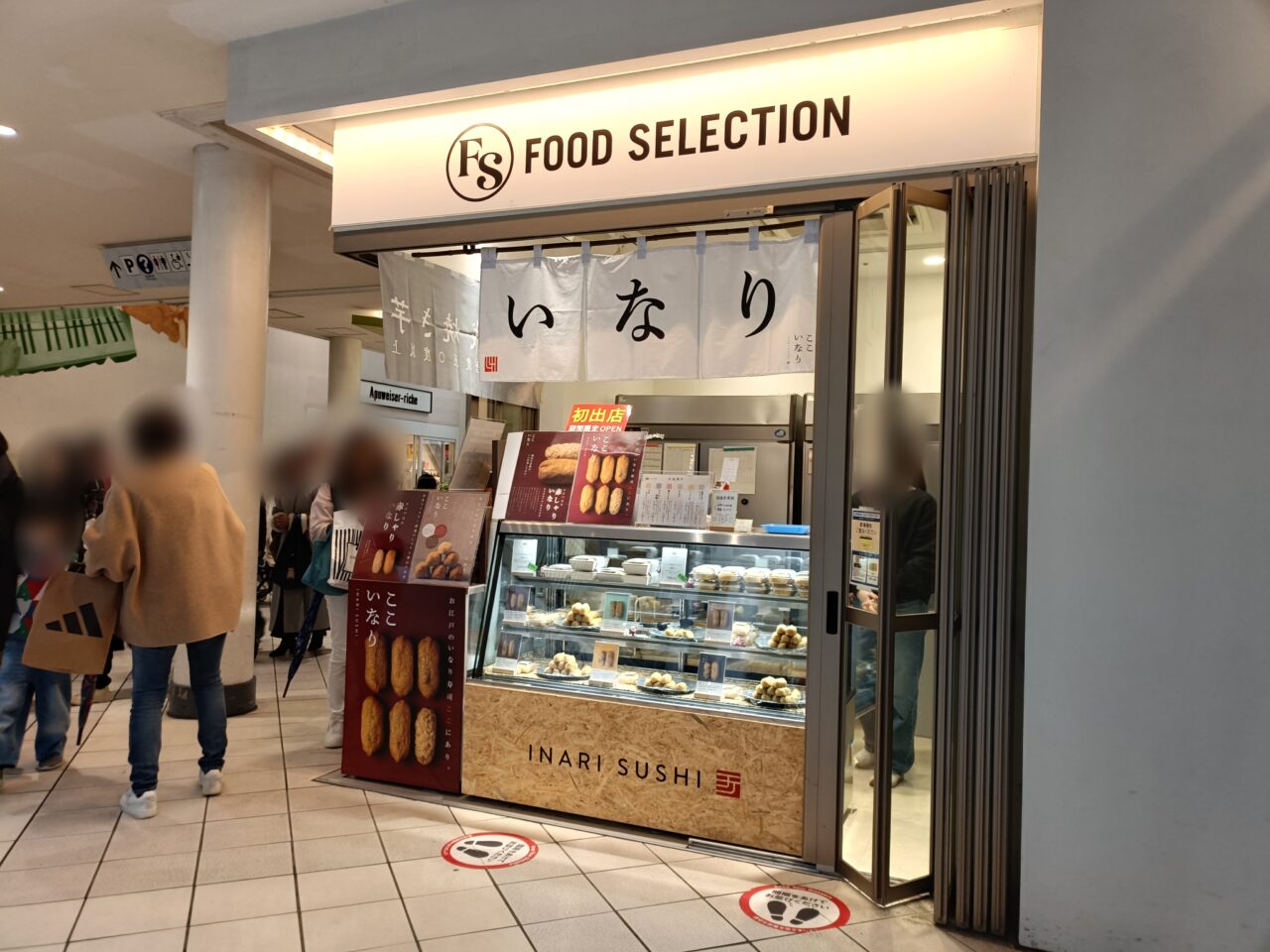 場所は、1階1650区画「FOOD SELECTION」。白いのれんに大きく書かれた「いなり」の文字が目印で、ショーケースには「わさび」、「梅ひじき」、「五目」などさまざまな種類のいなりずしが並んでいます。