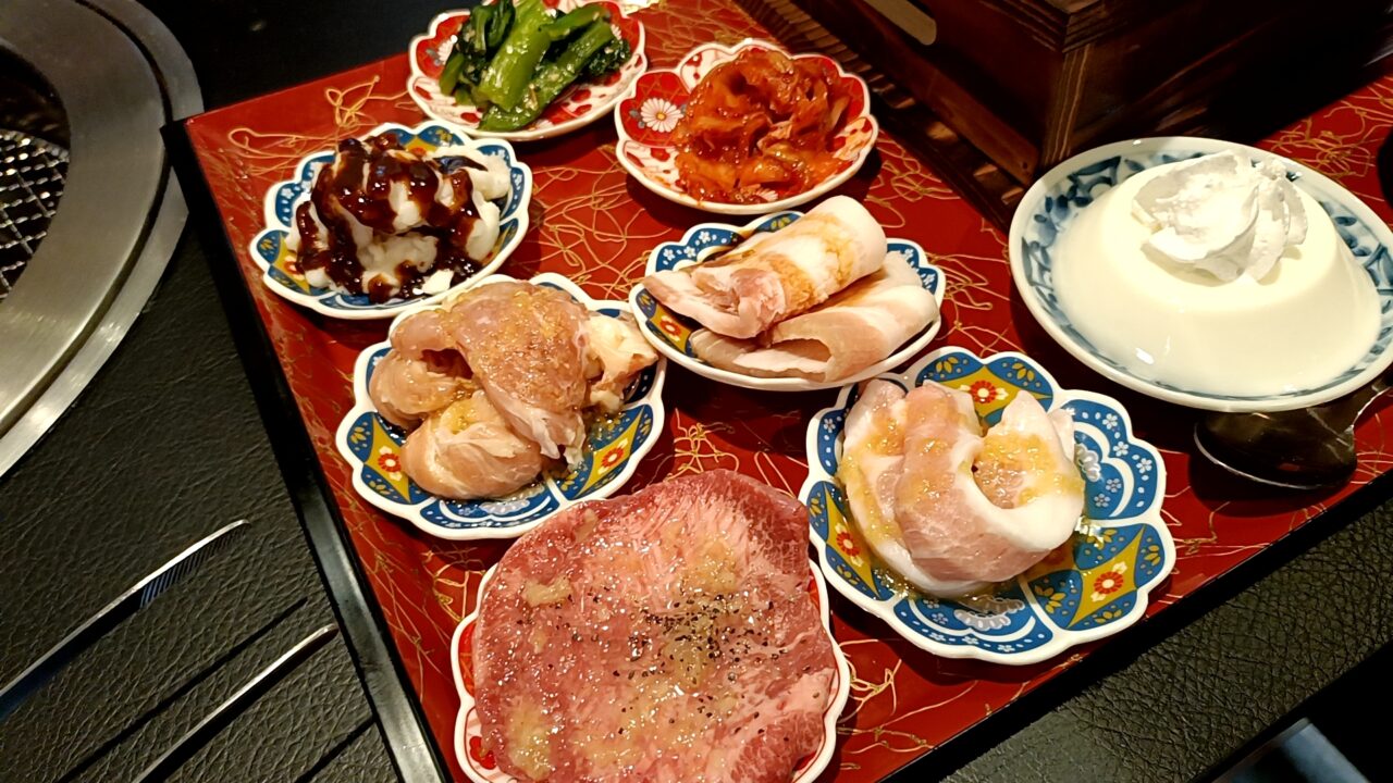 数種類のお肉を少しずつ楽しめる内容で、副菜やお味噌汁、さらにデザートまで付いた満足感たっぷりの御膳です。いろいろなお肉を味わいたい方には特におすすめだと感じました。