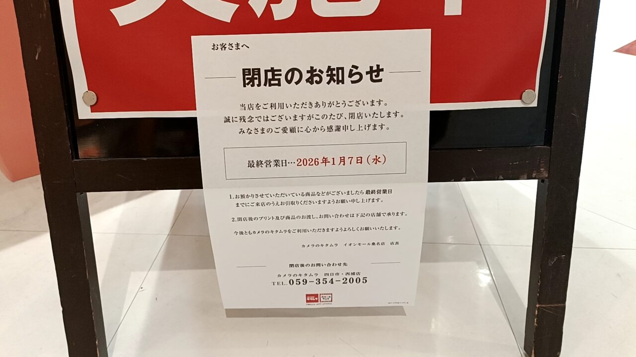 【桑名市】悲報。イオンモール桑名の『カメラのキタムラ』が閉店へ。最終営業日は2026年1月7日(水)。