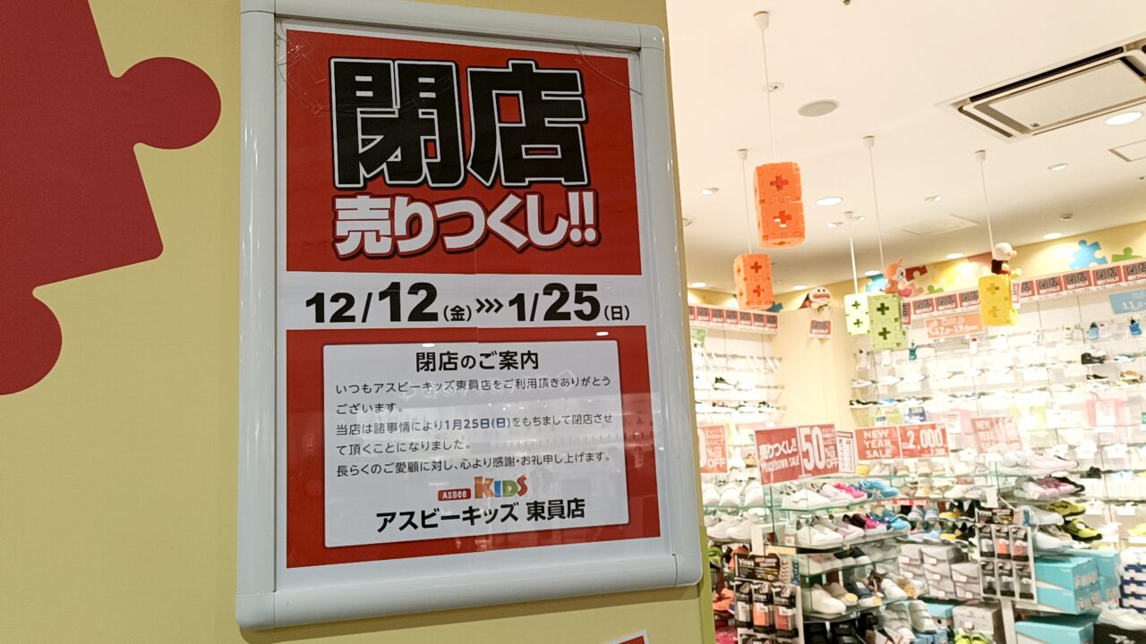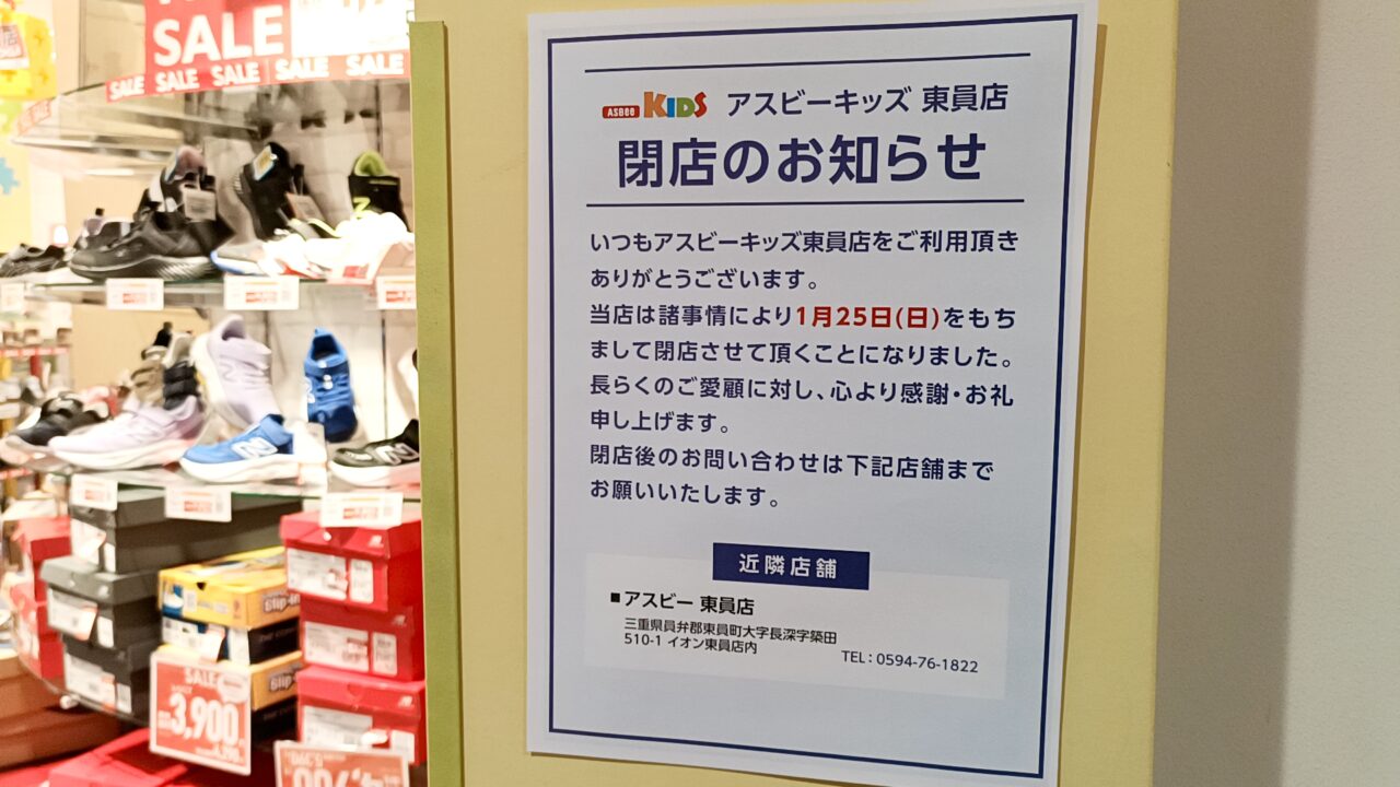 イオンモール東員専門店街3階にある、子ども靴専門店 『アスビーキッズ 東員店』 が、2026年1月25日(日)をもって閉店することが分かりました。