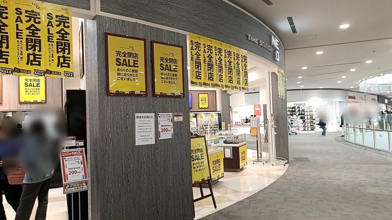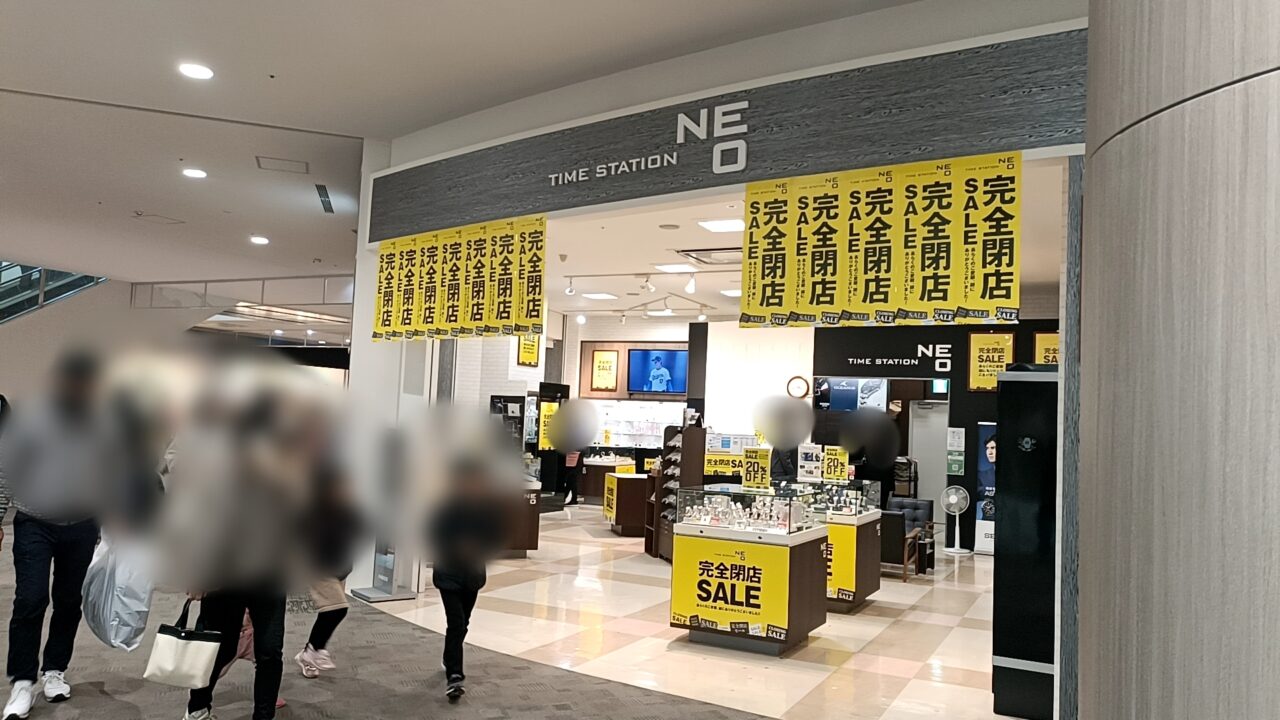 2025年12月31日に現地を訪れた際、店頭には「完全閉店SALE」と書かれた黄色い掲示が数多く並び、閉店に向けたセールが実施されていました。明るい売り場には腕時計や関連アイテムが並び、普段から利用していた方にとっては、少し寂しさを感じる光景となっていました。