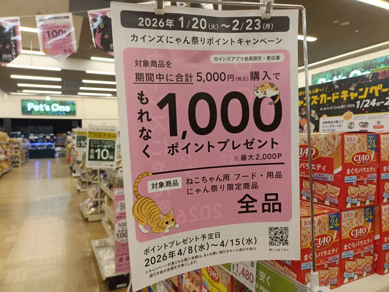 開催期間は2026年1月20日(火)~2月23日(月・祝)。期間中、ねこちゃん用フード・用品・にゃん祭り限定商品を対象に、対象商品を合計5,000円(税込)購入すると1,000ポイントプレゼント(※最大2,000ポイントまで)されます。いつものごはんや猫砂をお得に購入したい方におすすめです。