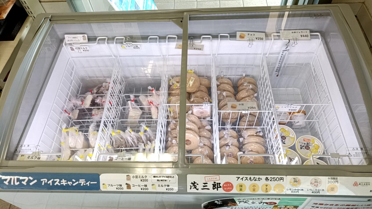 さらに、冷凍ショーケースには、かき氷で有名な「しろざけや茂三郎」のアイス最中や、「マルマン」のアイスまんじゅうなども並んでおり、立ち寄るだけでも楽しめる充実した内容となっています。(※2026年2月23日時点)