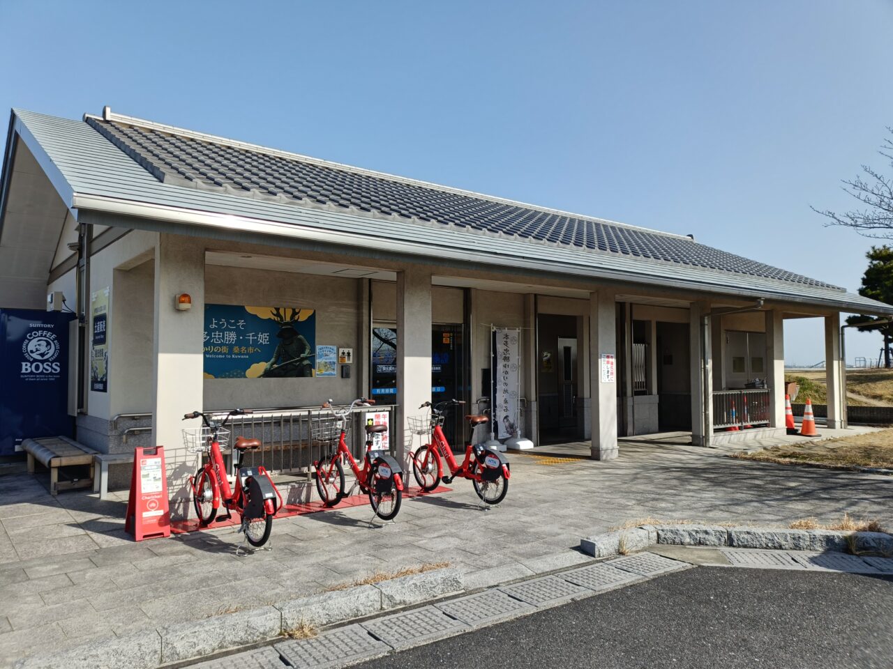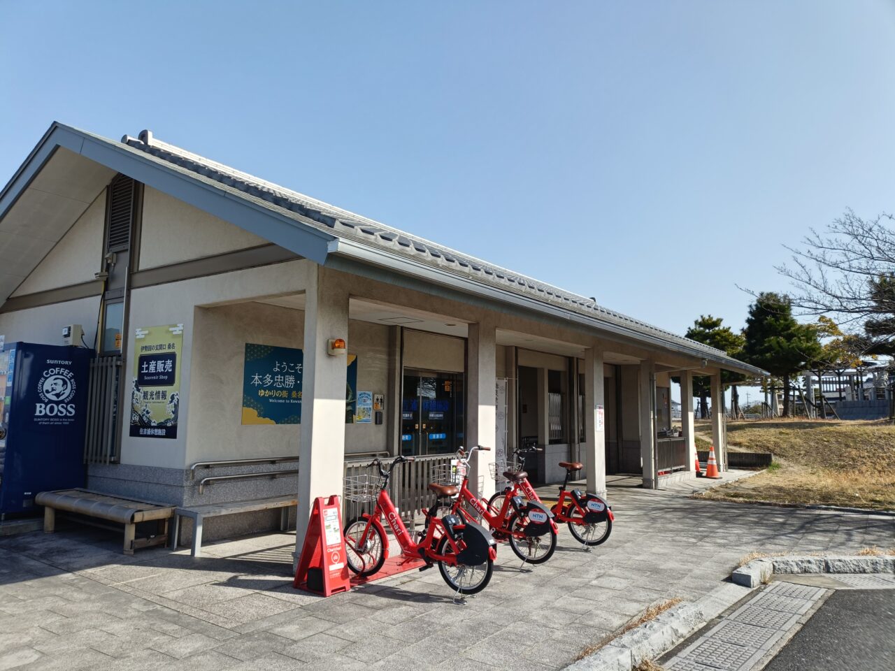 「住吉浦休憩施設」は、六華苑や七里の渡跡の近く、揖斐川の堤防沿いにある観光案内所兼休憩施設。館内には桑名の名産品や本多忠勝グッズなどが並び、桑名土産を探している方にもおすすめのスポットです。