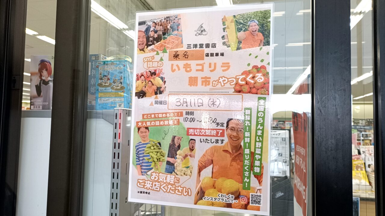 【桑名市】旬の野菜やフルーツがお得!話題の「いもゴリラ朝市」が3月11日(水)「三洋堂書店 桑名店」に登場♪