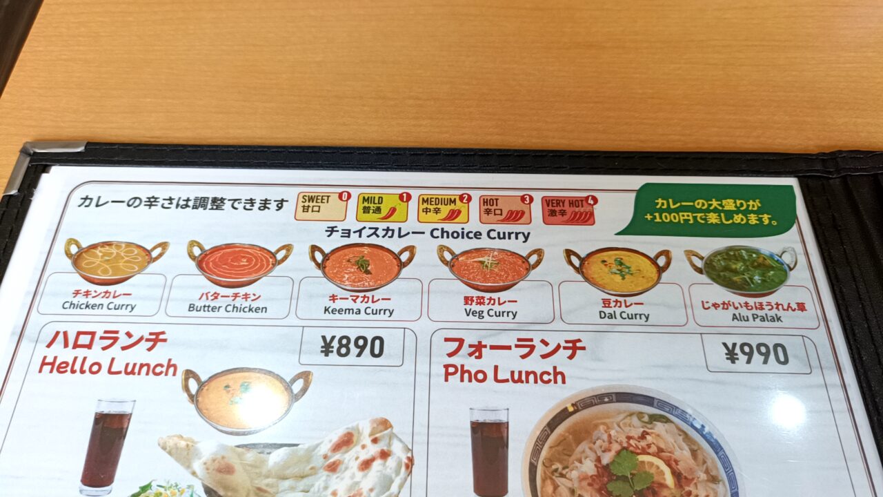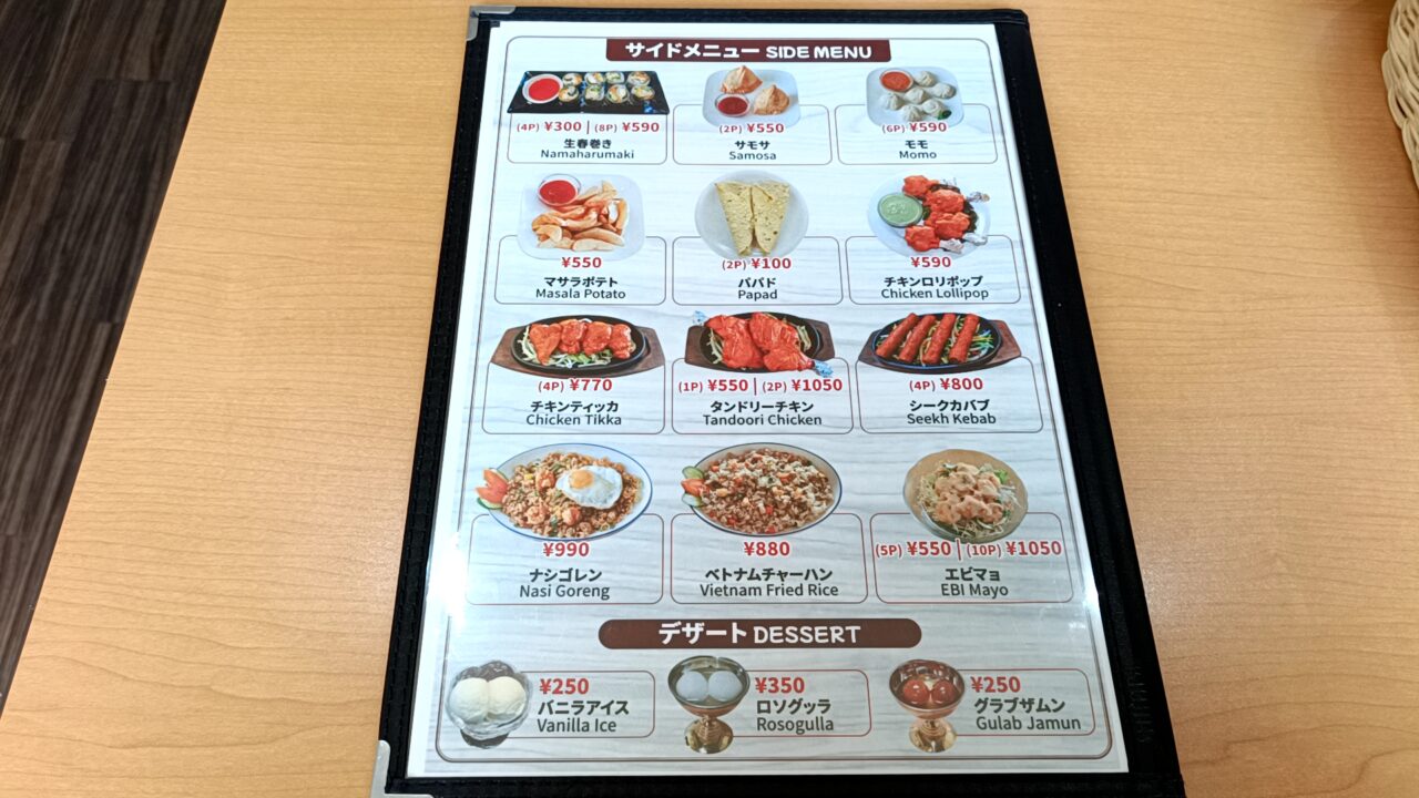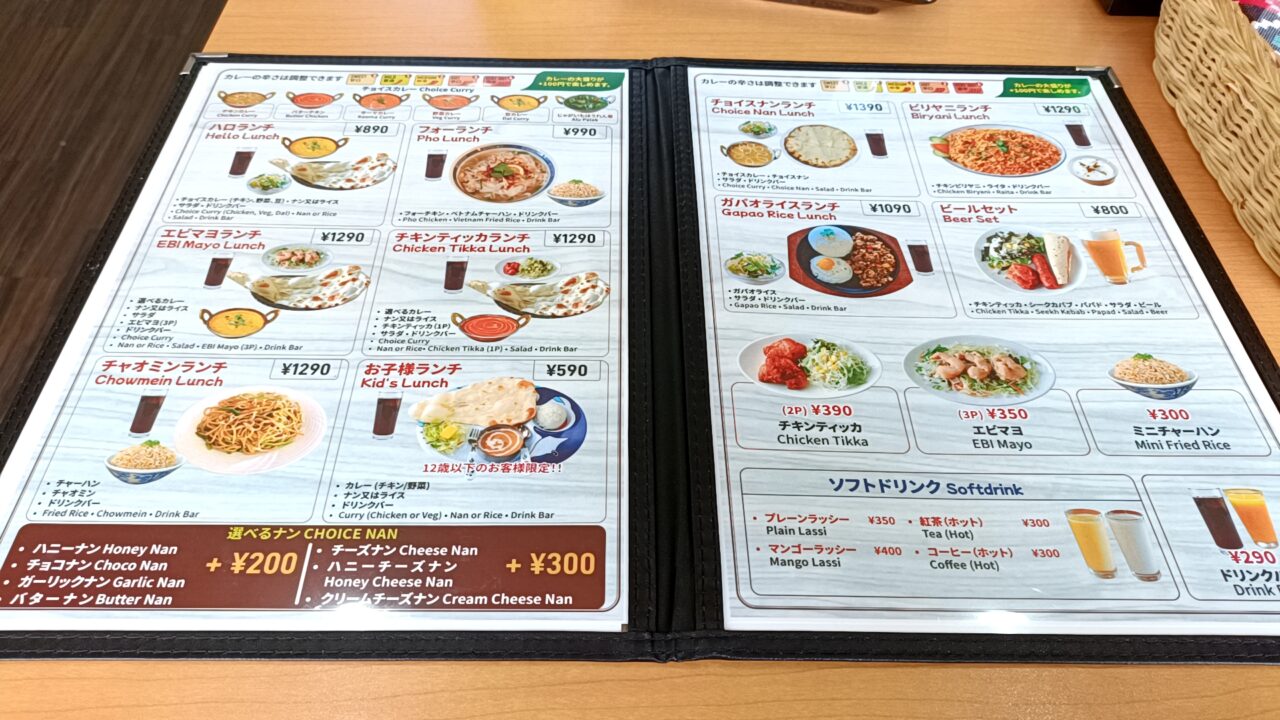ランチセットはすべてドリンクバー付きで、お手ごろ価格なのもうれしいポイント。メニューを見ると、カレーやナンの定番ランチに加え、フォーやビリヤニ、ガパオライスなどもそろっており、その日の気分でさまざまな味を楽しめます。サイドメニューも充実していました。