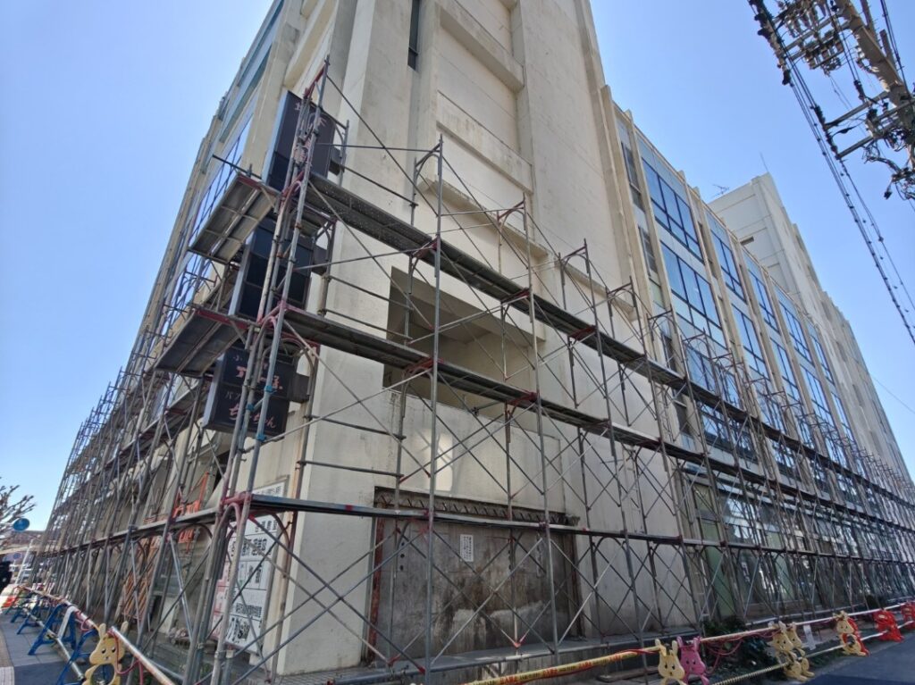 建物の周囲には足場が組まれ、「桑栄ビル解体工事開始のお知らせ」と書かれた掲示も設置され、桑名市ホームページでもお知らせが掲載されていました。2026年3月30日より工事が開始されたようです。