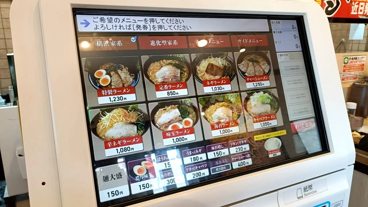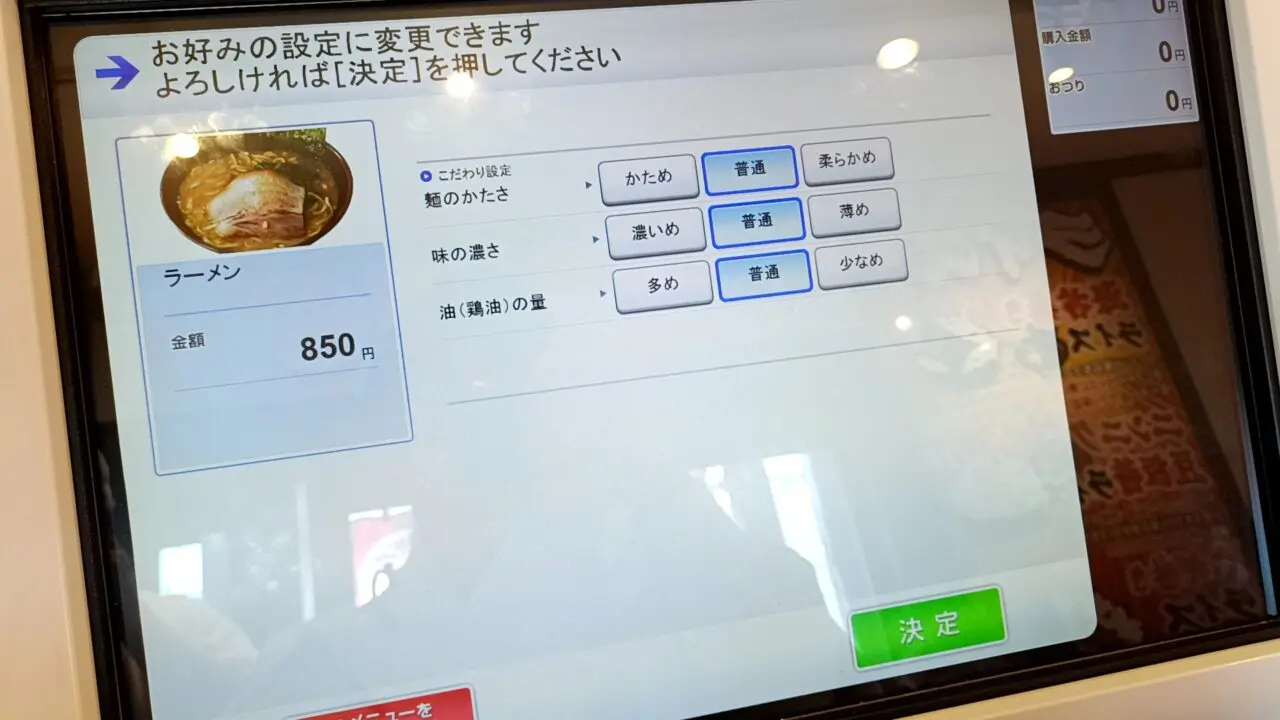 注文は券売機による先払いシステム。麺のかたさ・味の濃さ・油の量はお好みで調整できます。