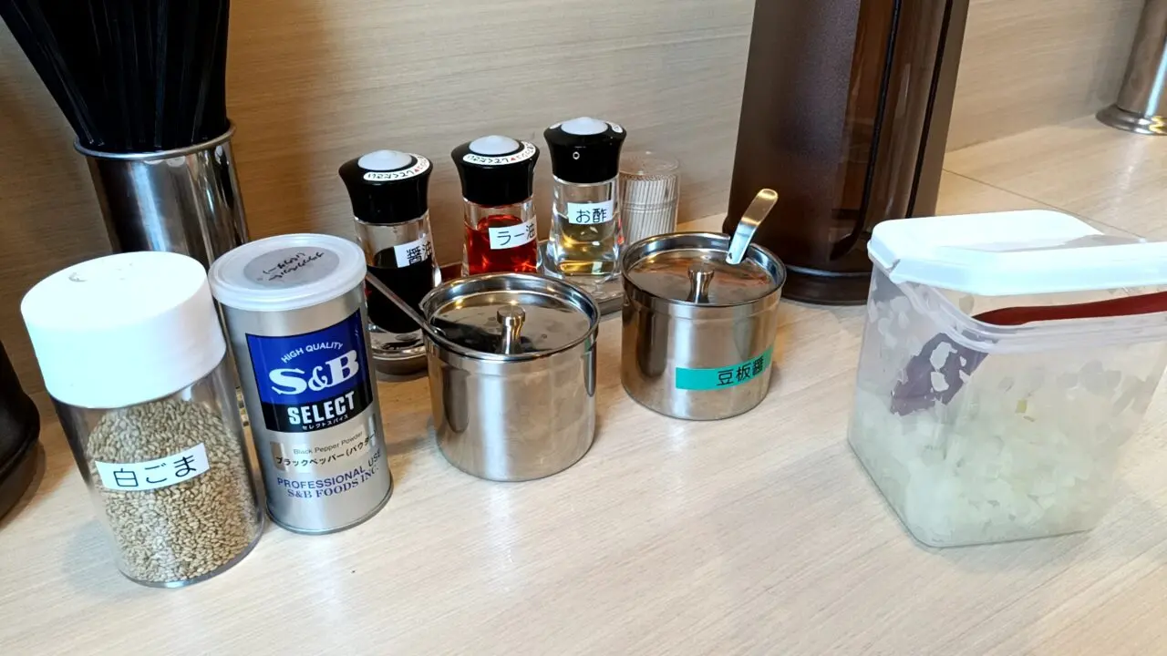 さらに、卓上には刻み玉ねぎや豆板醤、にんにくなどの調味料が充実。途中で自分好みに味変できるのも嬉しいポイントです。平日ランチタイム(15時まで)はライス無料サービスもあり、ガッツリ食べたい方にもぴったり。