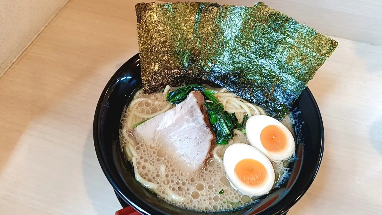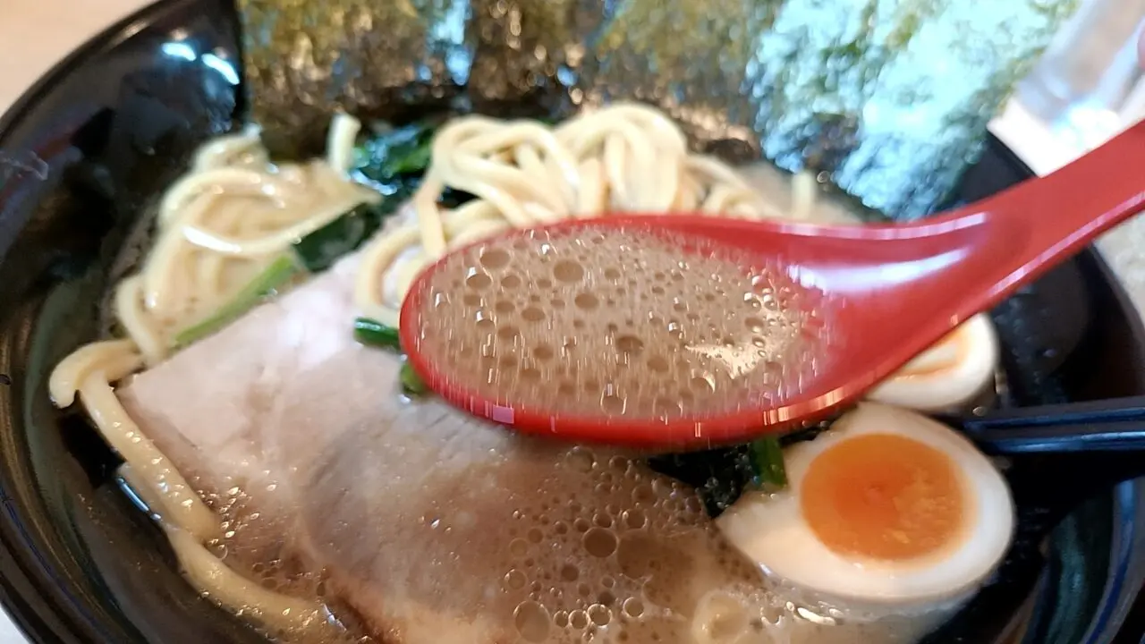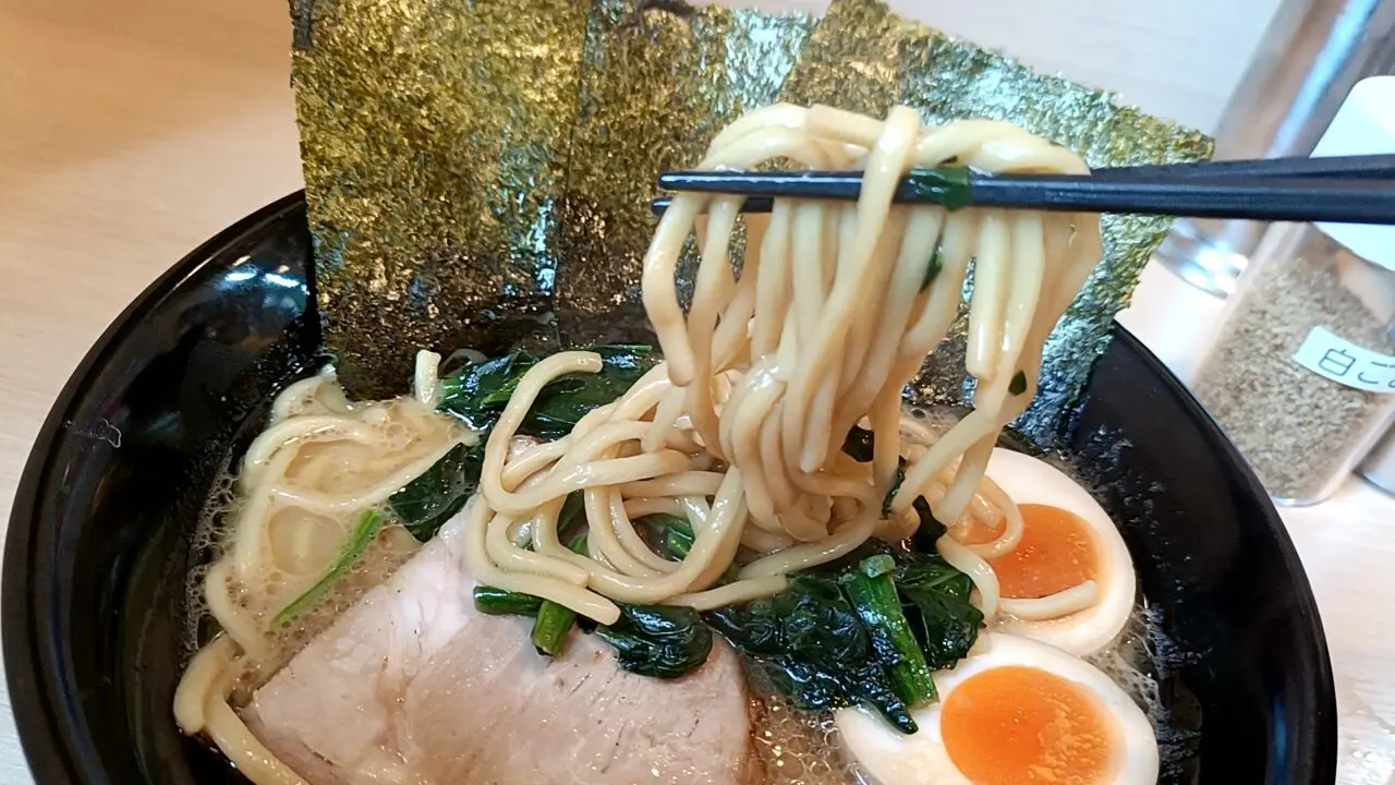 麺は中太でモチモチ食感。濃厚スープとよく絡み、家系らしい満足感のある一杯に仕上がっています。トッピングのチャーシュー、ほうれん草や海苔との相性も抜群です。