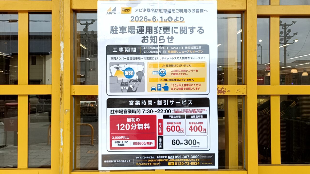 『アピタ桑名店』で、駐車場の利用方法が変わるようです。