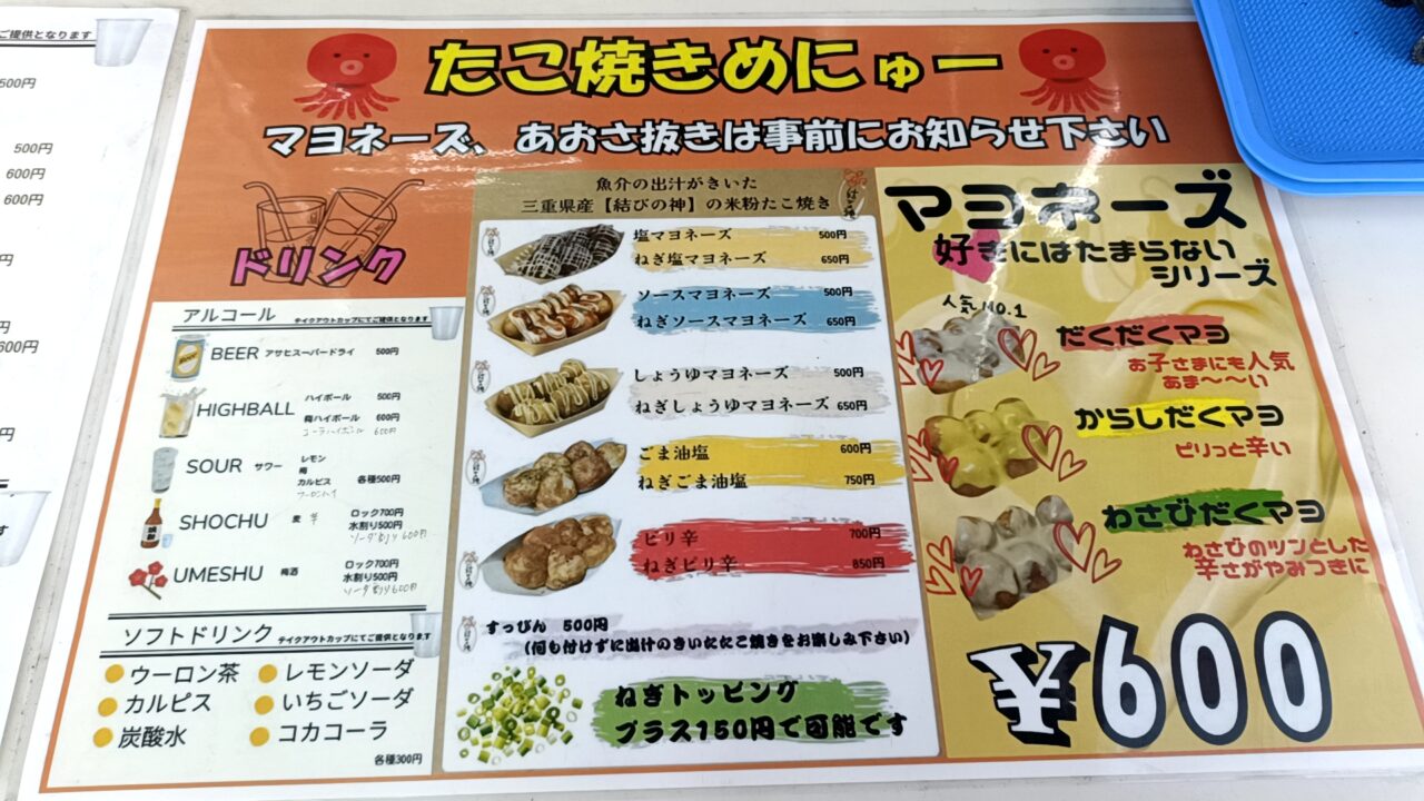 味の種類もいろいろあって、定番のソースマヨやしょうゆマヨのほか、塩マヨ、ごま油塩、ピリ辛などもラインナップ。さらに、だくだくマヨやからしだくマヨ、わさびだくマヨなど、ちょっと気になるメニューも並んでいました♪